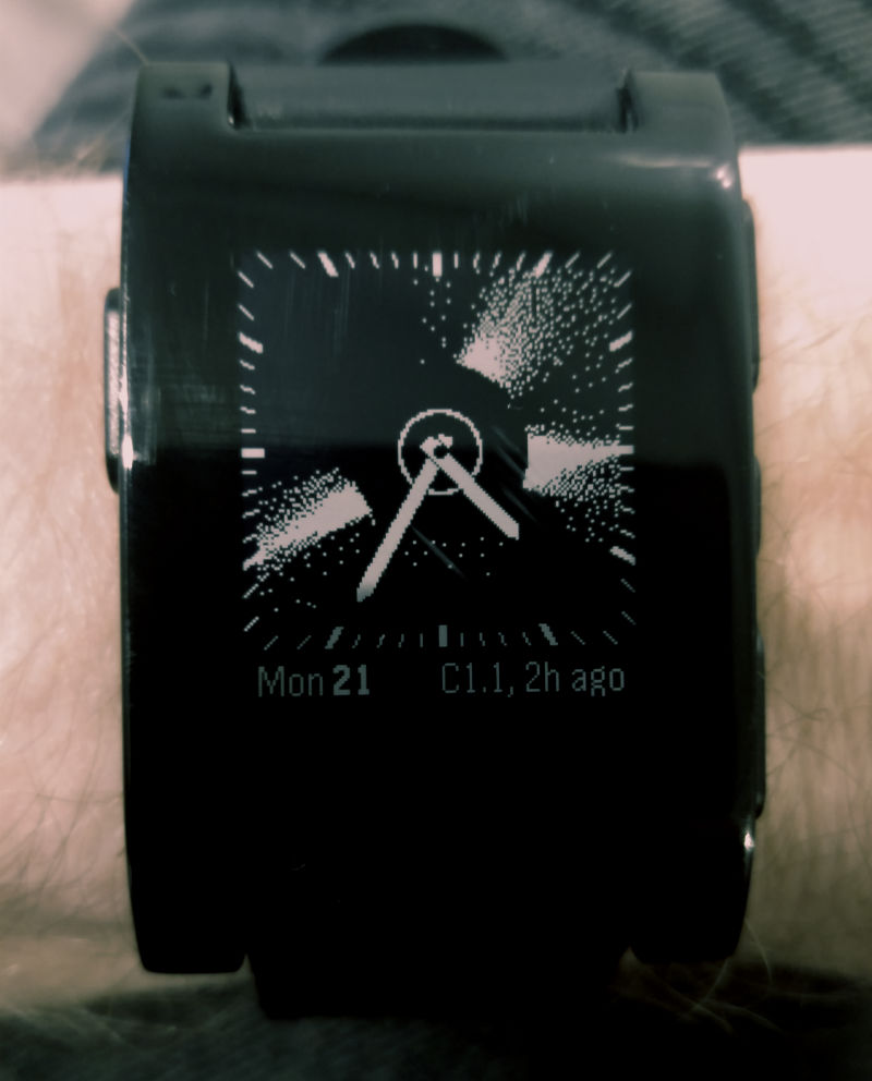 I got a first-gen Pebble recently. This is not going to be a product review, except to say that I’m kind of surprised how helpful for my focus it’s been to keep my phone in my pocket. Rather I mention it to say that, of course, it being a smartish watch, there are a plethora of custom watch faces that you can use to insert whatever data into the carrier wave of you glancing at your watch. The one I keep it on most often is this: