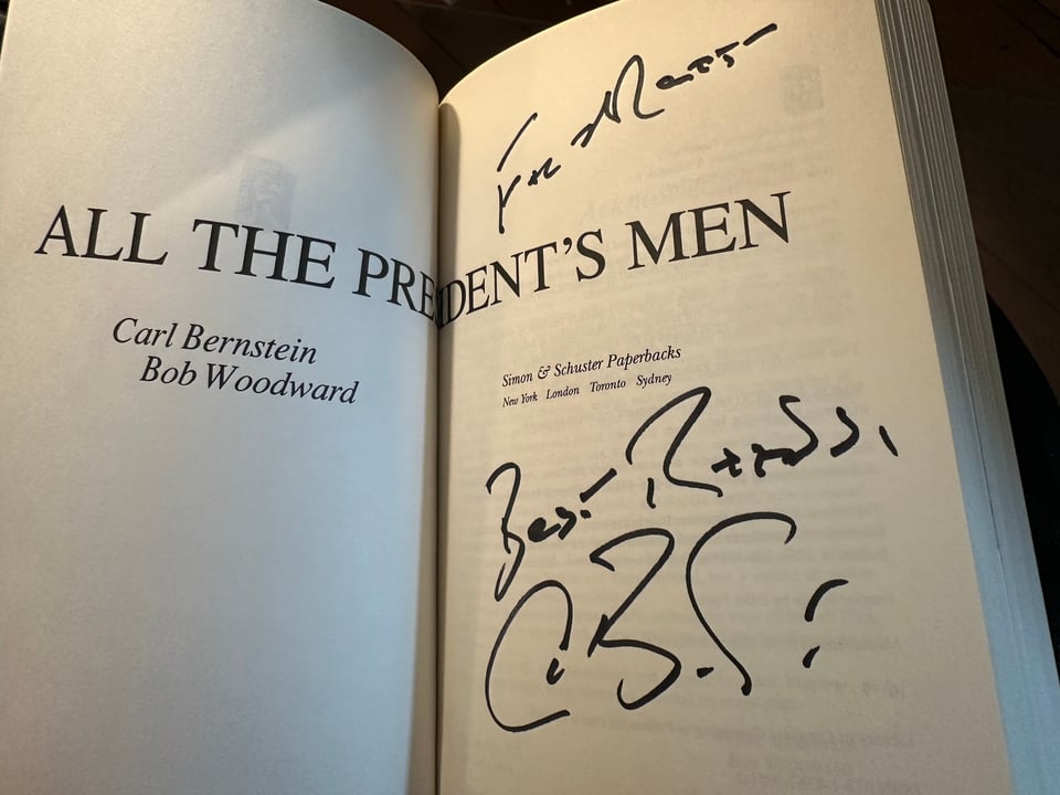 And then Carl Bernstein spoke. And he was cool. His speech was so good that I approached him afterward and asked if he had a copy he could send me (he said he only had his own notes.) Somehow I got to join the small meet-and-greet after, as well and got a signed copy of the book he and Woodward wrote called All the President’s Men. My kid would later read it as prep for a Model UN session, and now knows everything about Watergate.