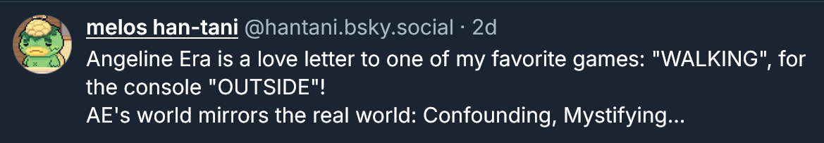 One last thing I found interesting was all the comparisons we’ve received to different games. It’s flattering, for one, to be compared to Treasure, Quintet, Falcom, Square, Hydlide, etc - but I’m additionally happy how the comparisons are so wide-ranging which I think speaks to how Angeline Era is really exploring some new design territory of its own. You can’t really pin it down with a single comparison (the bane of my marketing for this game, haha). But that’s the kind of work I want to do.