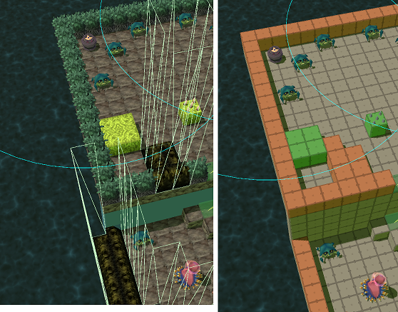 The vast majority of collision in this game is automated. When we go from the greybox stage (right) to the basic art pass stage (left), we mostly use flood-fill tools to replace e.g. the brown boxes with “Blocker”-type cubes, which we then have another tool to generate the invisible walls (in green). Due to quirks of the cube-placing system, there’s occasionally some places the wrong Blocker appears, and we’ll be missing an invisible wall (e.g. there’s a missing one in the bottom of the left image). So I’ve been glancing through all the levels to clean these up (how fun!)