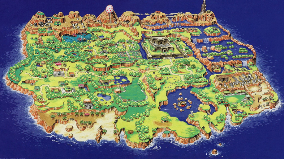 To be honest, part of my motivation is a more childish one, I simply thought it would be nice to have a game that could have a nice, big world map illustration done for it, accurate to the layout of the game. One in which every level has some kind of memorable vignette or aspect to it that you could convey on a drawn map, a very tiny story, or a comic-like illustration. I’ve had this illustration of Link’s Awakening’s world as my wallpaper for a while…