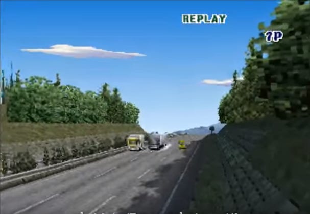 Yet, the blocky pixels of the black and white photo is reminiscent of early 3D games on the Sony Playstation, such as this one from 爆走デコトラ伝説 (Bakusou Dekotora Densetsu、1998)