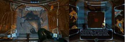 In many video games, particularly 3D games of the 21st century, there is a ton of visual content on the screen, and thus, the game must apply or offer filters so as to show the game’s player what the relevant information is. In this example from Metroid Prime (2001), the left image shows the ‘normal’ vision, as the player is fighting an enemy. In the right image, the player has used the ‘Scan Visor’ vision mode, which tags relevant environmental entities with orange squares. The player can then scan these to gain information on the entity, such as how to fight it. The game offers other vision modes, such as Thermal and X-Ray, which sort of work like you might expect — seeing heat, and seeing through walls.