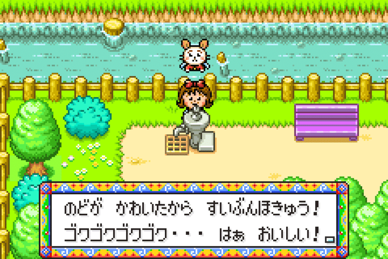 In "Sakura Momoko's Uki-Uki Carnival," you can drink water by pressing the A button, but… that's it. It feels like something’s missing. So, in our game, I want you to use the sense mechanic to have Hoshino taste the water.