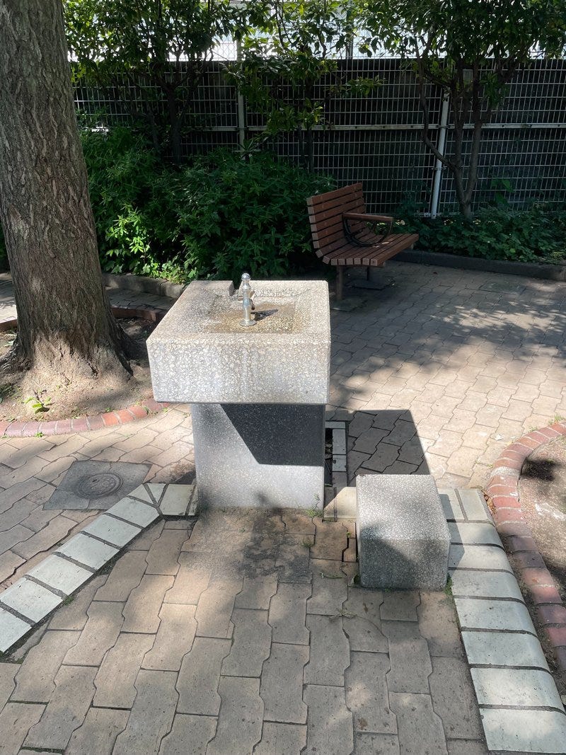 I like the water fountains you find across the city. I prefer to carry as little as possible when I take a walk, so I don't carry reusable or disposable water bottles, and instead quench my thirst at a water fountain. These days, water fountains at trains stations are being abolished, one after another, and water fountains in parks are becoming an increasingly valuable place for the thirsty citizen. In particular, on hot days I feel especially grateful when encountering a water fountain in a park.