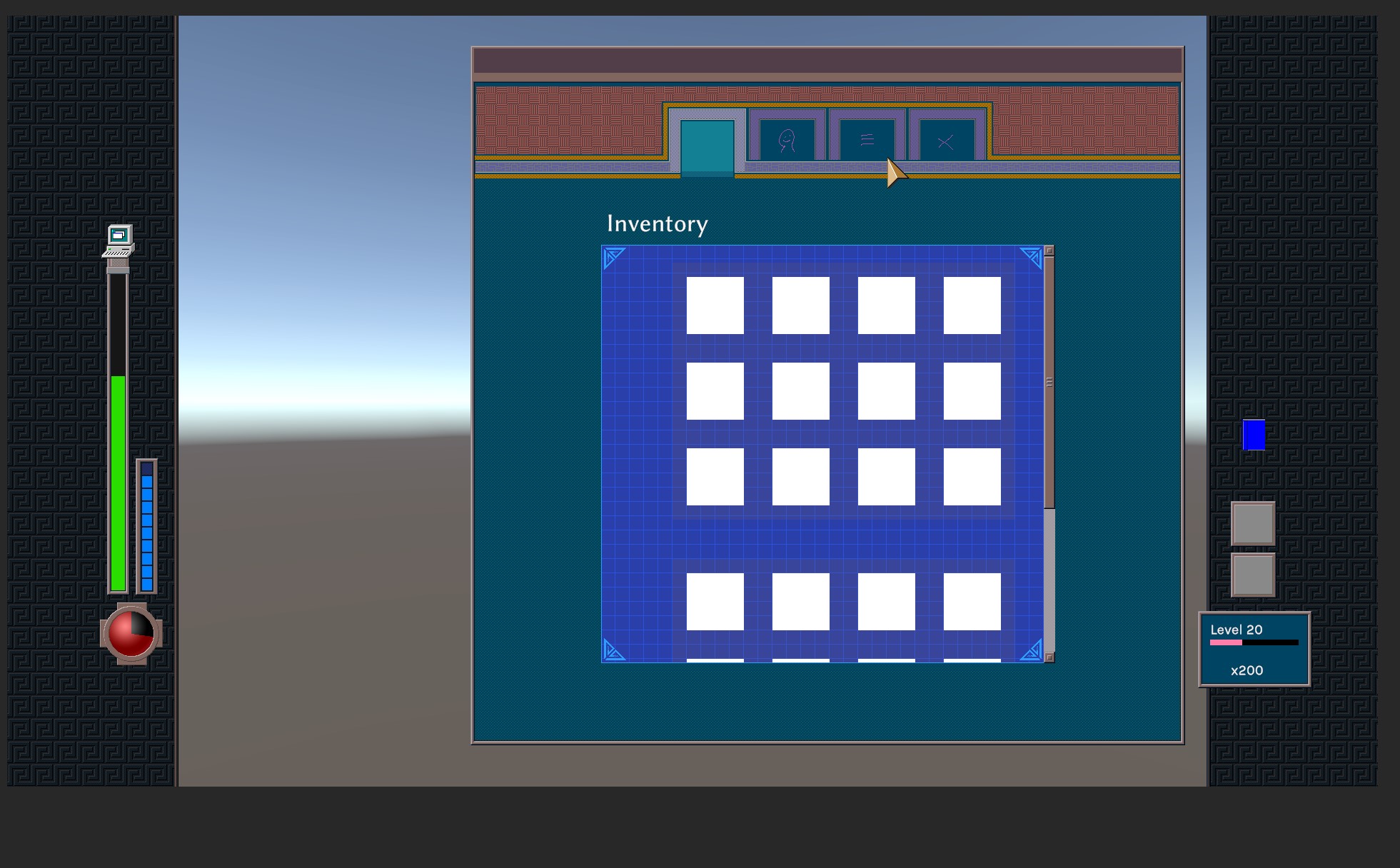 At this point we put together a pause menu, adapting Sephonie's logic. ultimately the visuals changed to something more minimal. You can also see the (now unused) EXP bar on the right.