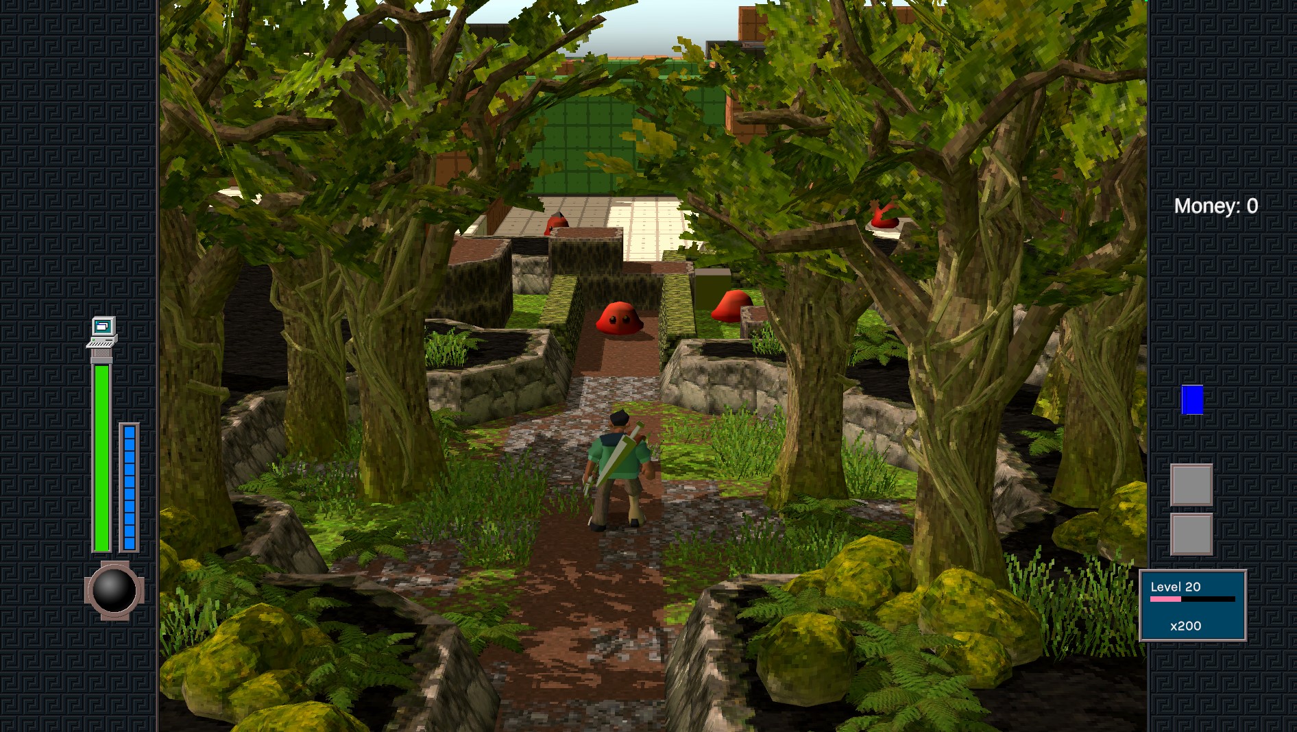 Above is an early screenshot. You'll see the Anodyne slimes (from when we considered this Anodyne 3), which became Angeline Era's Bugdogs (visible in trailers). The art style today is similar, but it's a bit less 'realistic' - in that even if objects are repeated next to each other, they seem intentional. (Compare two copies of a realistic tree, compared to two copies of a Pokemon Red tree. Which feels stranger to see?)