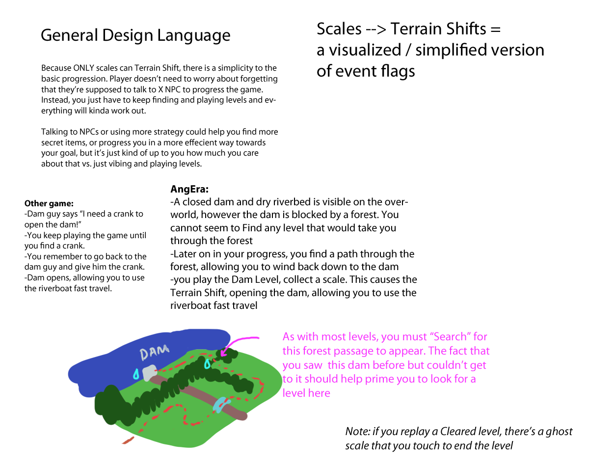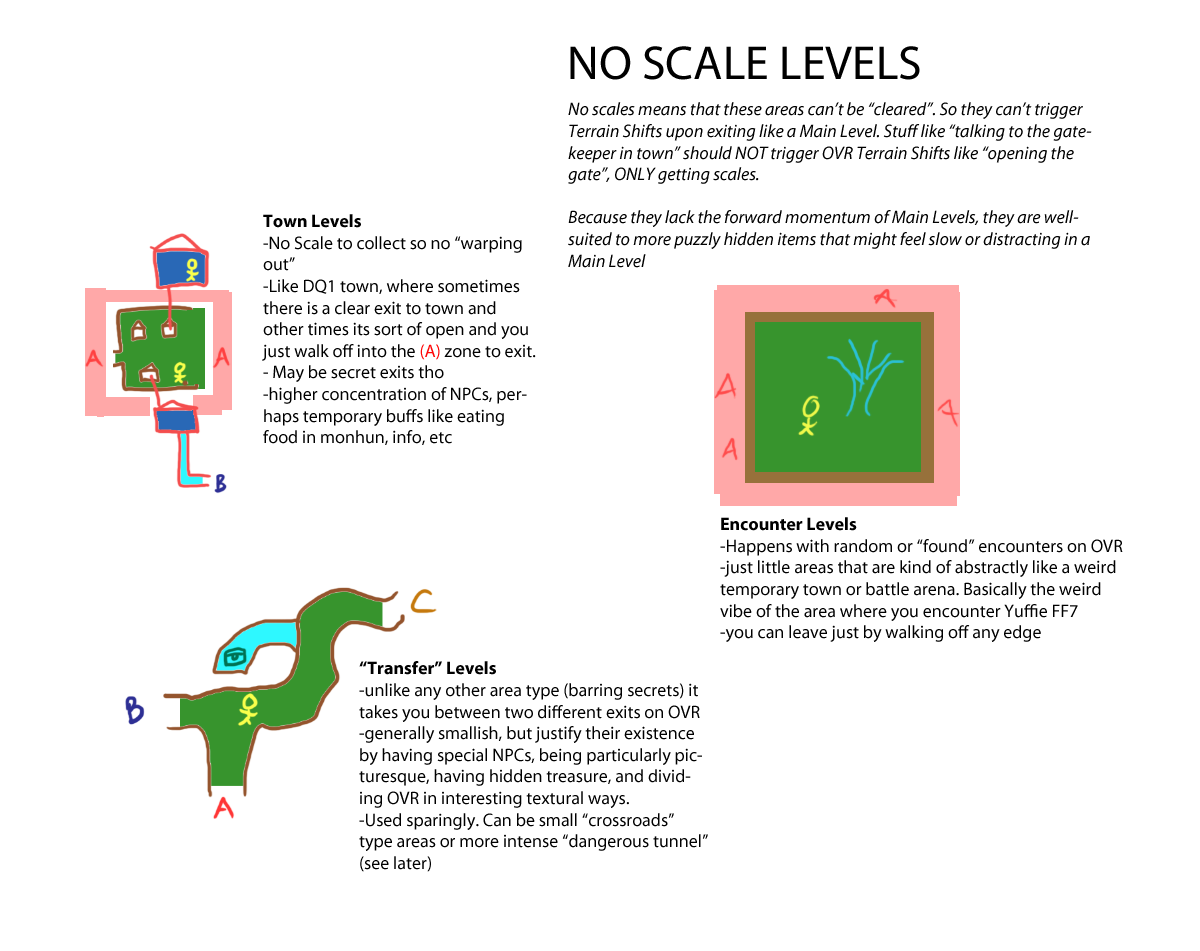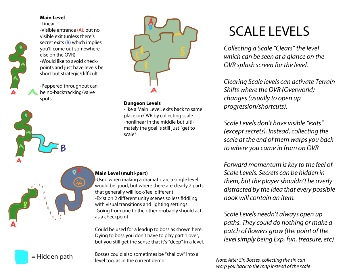 You see, levels used to be made so that when you beat them, you exit to a different part of the world map. This is a little confusing to navigate or understand, especially because we want you to Clear Levels to Find Scales to Level Up. How do you know a level is cleared? Can a Scale Level have two exits? Etc. We needed to clarify definitions.