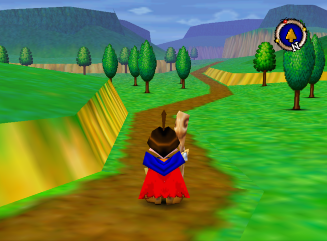 The world of Sanpo exists in no fixed orientation. There is no 'world map'. You always set out from one of many Towns in Sanpo. This leads you to a random level, associated with the Door you chose (e.g. exiting via the Town's Forest Door takes you to a random Forest Level). Each level has multiple Doors/exits leading to other levels - but - the levels they lead to are randomly picked! (Although there are ways to influence which level you end up in.) As you go from level to level (the levels are very small), a grid-based minimap automatically fills out to denote your current journey - one grid cell corresponds to one level. If you decide to enter or return to Town, the world resets, although your inventory/general story progress remain.