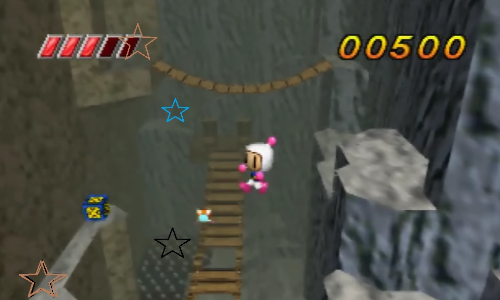 In the Bomberman Hero photo, we can see Doors denoted by the stars. There are two brown Doors, one blue, and one black. In Sanpo, the brown Door would lead to a random brown level, and so on. As simple examples, brown levels might be mountain-themed, the black, 'darkness'-themed, the blue, 'crystal cave'-themed, etc. Thus, although there is no 'canon' world map, we can still figure out over time that Mountain levels tend to be near Crystal Cave levels, etc.