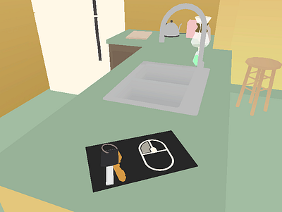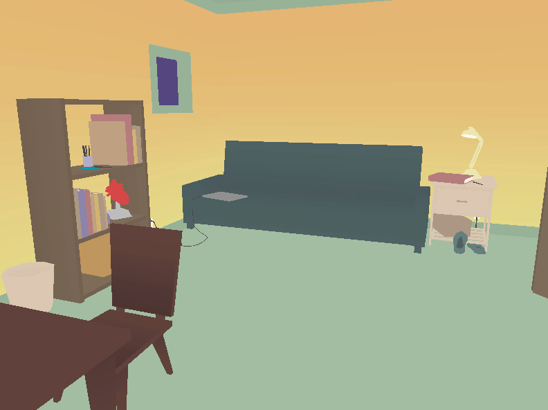 You can walk around the room a bit. The living-room/apartment architecture of the space, as well as visual cues in the 3D objects, remind us of what we use to feel more comfortable living: books to read, a laptop to work or entertain, couch to lay on, coffee makers, etc. Minimal 3D texturing and the inability to interact with such objects works well in contributing to the idea that we need to leave the room. It’s 7:41 AM, we need to leave, no time for play. I’ve felt similarly when leaving for high school, passing by various game consoles while making sure I had all of my schoolwork. In the context of Morning Coffee, we reflect on how these objects are for a different time, and how they play roles in our lives.