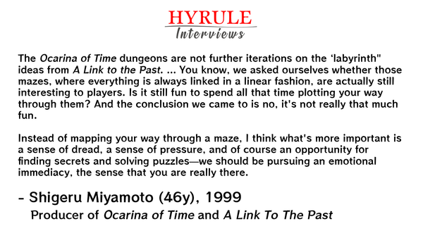 In the above quote, Miyamoto mentions an ‘emotional immediacy’ to Ocarina of Time’s world. Whether or not OoT’s puzzles are good (I think they vary wildly and can often be tedious,) the dozen or so challenges that make up its dungeons, collectively, create this sense of place to the dungeon that convincingly fixes it as a location within the story of OoT. I think this is something that gets harder to do the more people you have working with you.