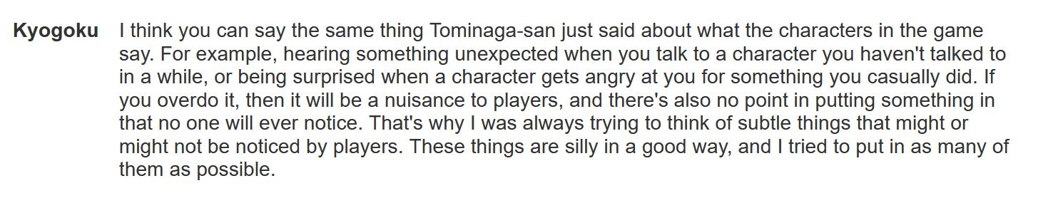 To be sure, it’s not like Zelda developers have forgotten everything from that period. There’s still a definite odd charm and whimsy to aspects of even TotK - a cave entirely packed full of rocks, a side quest about a fashionista trying to gentrify BotW’s farming town. However, these elements don’t exist in harmony so much as they’re packed in with a ton of other things. Kyogoku, another TP director, later talks about the subtle details that can make Zelda game worlds come alive, who always wanted to “[try] to think of subtle things that might or might not be noticed by players”: