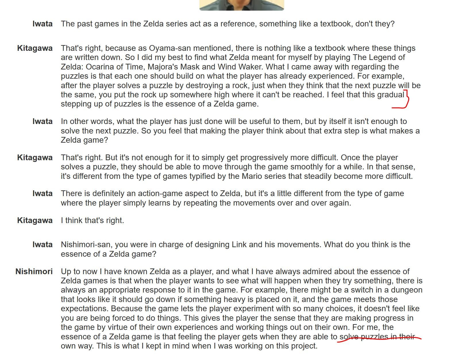 Read enough Zelda interviews, and you’ll always see employees grappling with “what is Zelda?” To be sure, it’s a tough position to be in - answering that and needing to please fans and make a profit. This question - “What is Zelda?” - and how future Zelda directors answer it - is the essence of what drives the change in the series. To illustrate, let’s look at this interview with the Twilight Princess (2006ish) directors. Red highlights in particular.