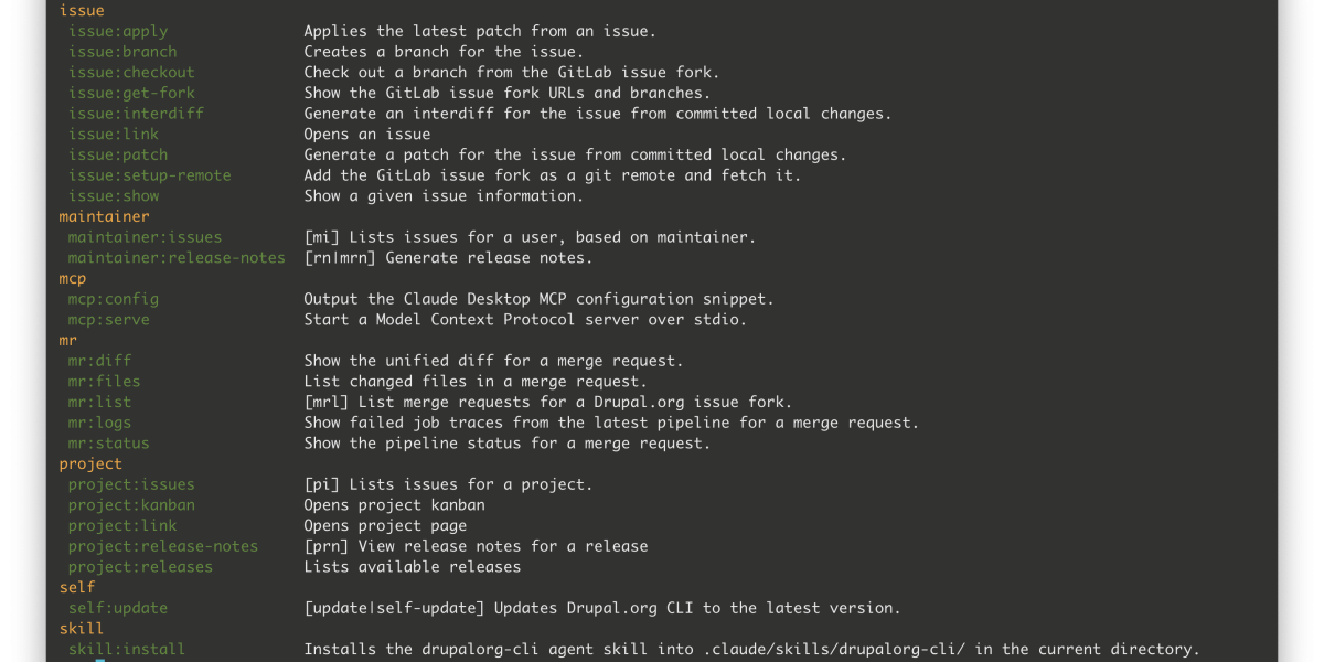 I recently dusted off my drupalorg CLI to fix the release notes command. I’ve also been meaning to add GitLab support to my work with Drupal Canvas. At the same time, I’ve been reading about AI agent skills and CLI. So here is 0.8.0! GitLab support and AI agent skills.
