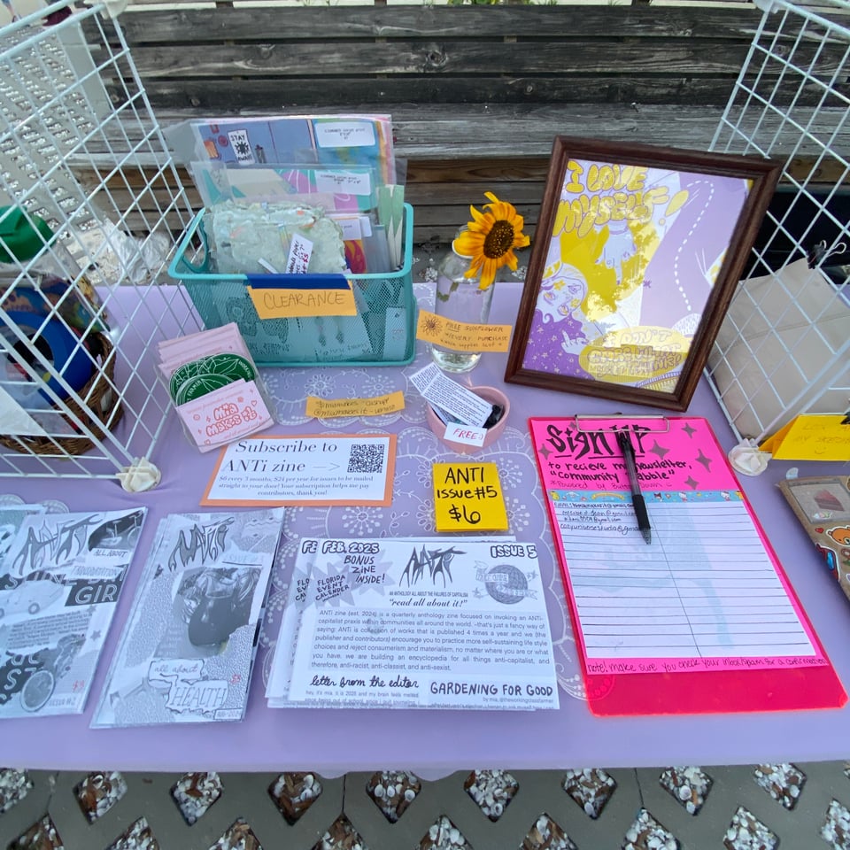 “ANTi zine (est. 2024) is a quarterly anthology zine focused on invoking an ANTi-capitalist praxis within our communities. we (the publisher, mia, and the contributors) encourage you to practice self-sustaining choices and reject consumerism and materialism, no matter where you are or what you have… we can’t do it all! but we can all do something. we also like to think that we are building an encyclopedia for all things anti-capitalist, and therefore, anti-racist, anti-classist, and anti-sexist.”