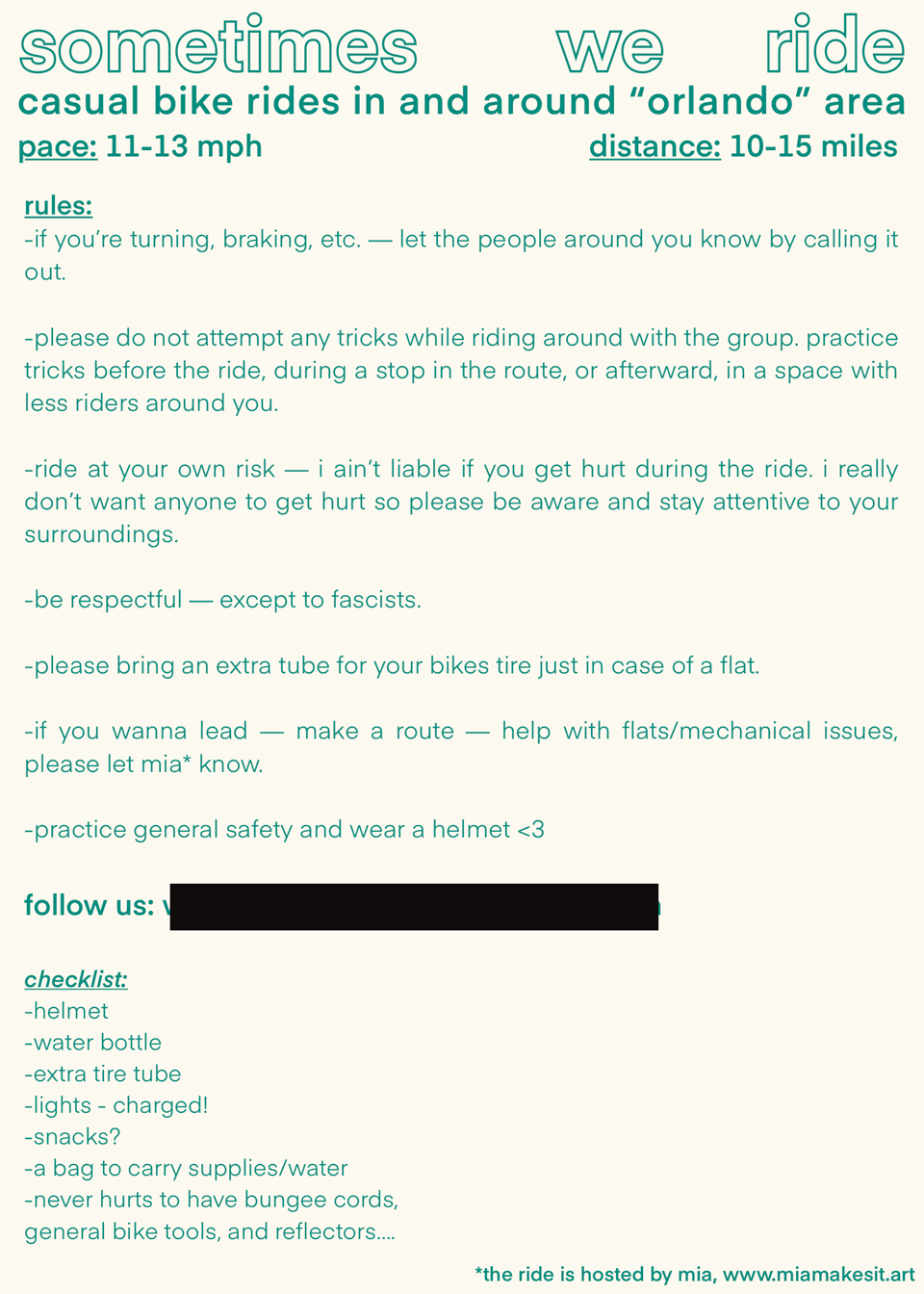 i have an instagram page for it, when i am ready i plan for it to just be a space to hold the link for the website and rules to live on, whenever people inevitably look for the ride on instagram. i have the website bones in place, i just need to style it (i’m on my ipad and it’s hard to code on it so i am waiting til i get home to launch it). here’s the flier i put together.