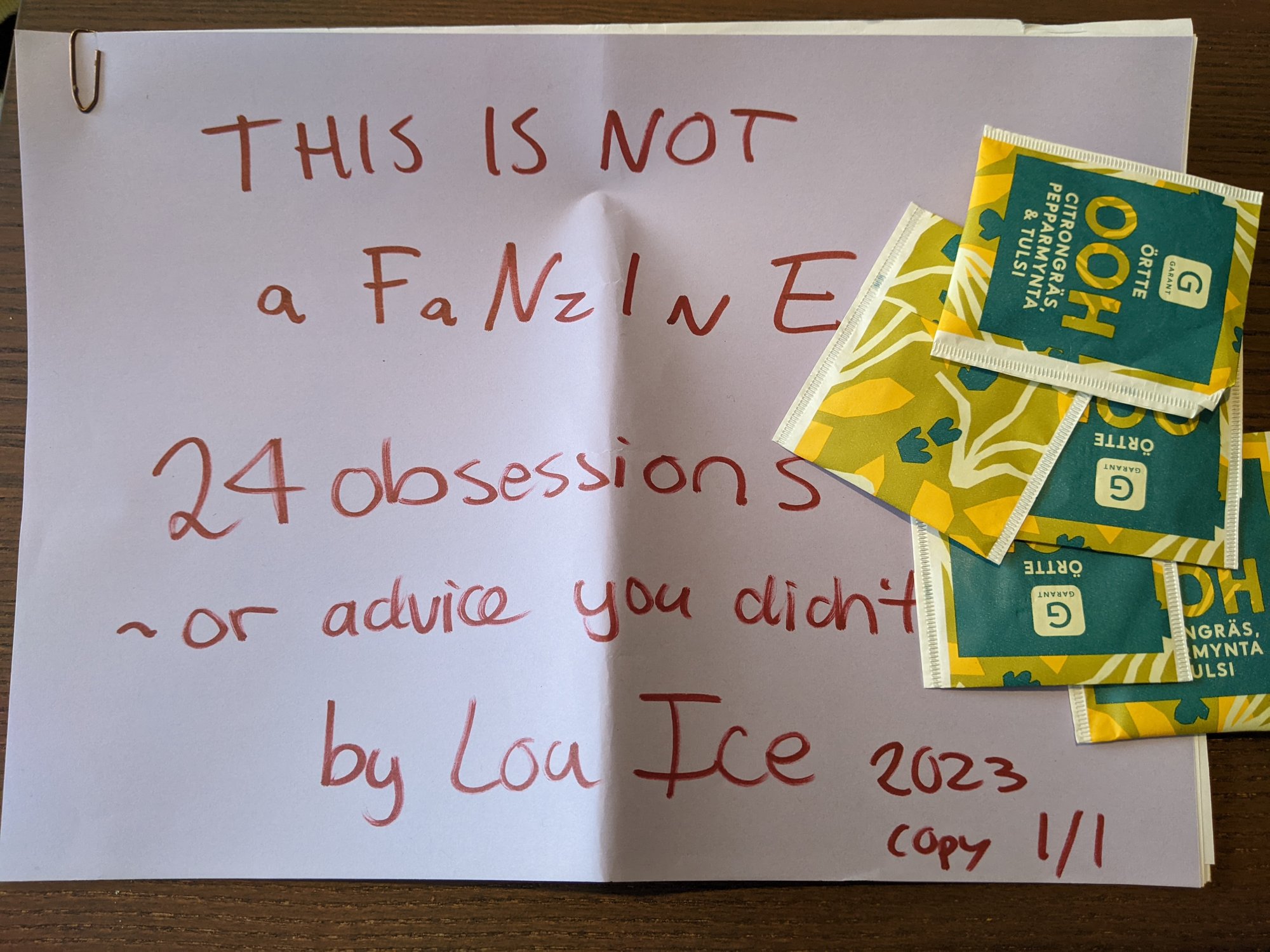 Recently Lou sent me the sole copy of a booklet she’d written called This is Not a Fanzine - 24 Obsessions or Advice you didn’t ask for (along with two boxes of my favourite Swedish tea). I loved it, and think it’s a shame that there is just this one copy. However, there is an album out called Pink Punk Poetry that you can listen to, produced by A/Z Sounds.