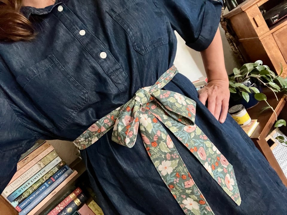 And finally, I made a ribbon belt to wear with a few denim dresses I have with not-defined-enough waists. I modeled it after the belt that came with another dress, and I look forward to making many more of these with other scrap fabric.