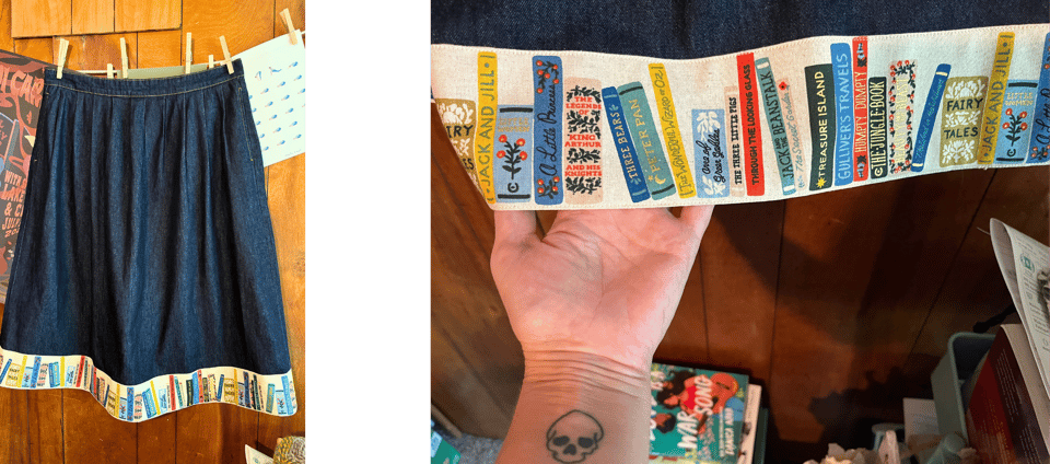 I naturally then had the sewing bug back in full force, so I decided to alter this skirt that I bought a while back but haven’t been wearing because I didn’t like the length. I chopped off the bottom panel and added … A BOOKSHELF.