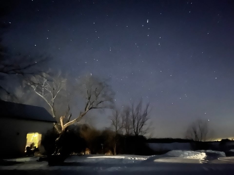 Also of note regarding said world, look what I finally captured on camera on Tuesday morning! WITH Night Mode on my phone, mind you. The below photo was NOT what I saw with my bare eyes ~ my bare eyes behind my frosty foggy glasses saw super bright white streaks above my house on the way back from my dog walk. But since my friend had told me that she was able to capture the northern lights the night before, I figured I’d try a photo and …