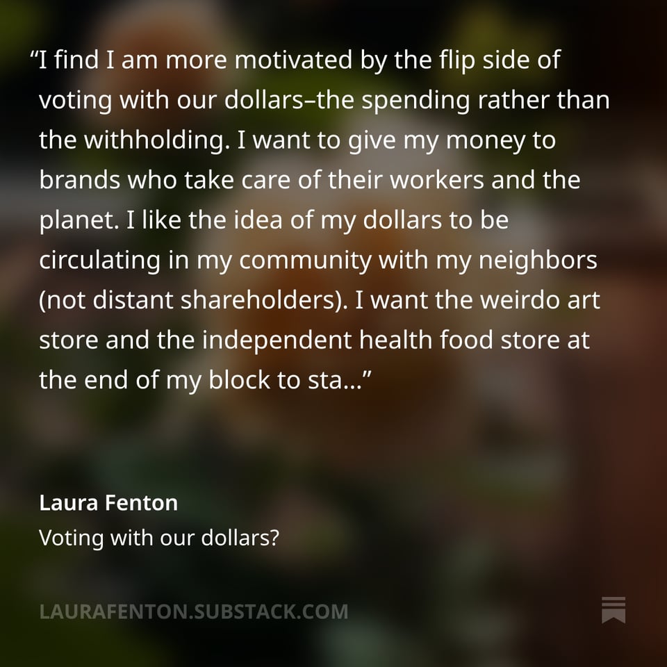 I absolutely LOVED this piece from Laura Fenton about voting with our dollars, because I too am weary of flash boycotts that are more about performance than power and also… I have been untangling myself from Amazon for almost two years now, have remembered for years that Wal-Mart is the original Main Street enemy, won’t step foot in Hobby Lobby, am being told to boycott Target, and also … am told to shop local (it’s bad for the environment to ship small things!), but … where besides any of those places above do you buy 1.5” elastic for sewing waistbands if you don’t have a local indie that sells this product? Online from an indie across the country and hurt the environment with shipping or locally from a big box store?
