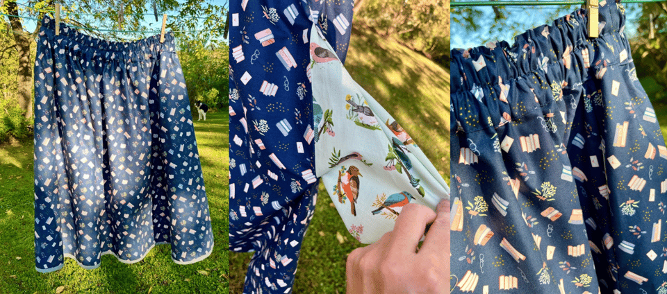 Yes, yes, I already sew, but those skills are limited to lots of other things and only ONE garment ~ my favorite skirt pattern. I made another one last Sunday and just LOOK at that adorable book fabric!