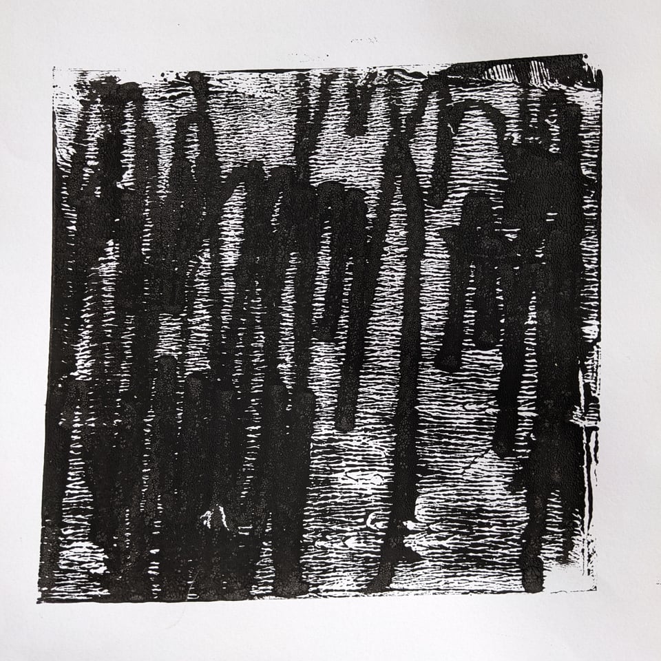Do the most obvious thing, so I made monoprints with the bark fibers. That was ok, but the piece I liked the most didn’t have anything to do with bark fibers, it was just ink and a spoon tracing shapes. Why a spoon? I’d heard that printing was possible using a spoon. The beautiful effects from print are achieved with expensive equipment, namely, a press. A press has a heavy roller that can be applied with high pressure to a plate with ink and moistened paper. These are sandwiched between layers of felt that push against the paper that pushes against the plate. Without researching it more, I heard, “Spoon!*” and just tried it. *also a Tick reference.