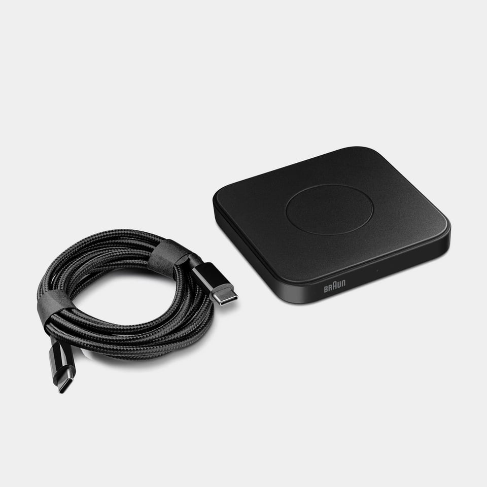 Under the design leadership of Oliver Grabes and with the reintroduction of Braun Audio and technology design outside of their grooming product range, the renowned German brand has produced quality objects with a consistent simplicity we have come to love. The minimal wireless charger features magnetic charging technology enabling precise alignment for fast charging. Designed to be compatible with the latest iPhone models with MagSafe technology.