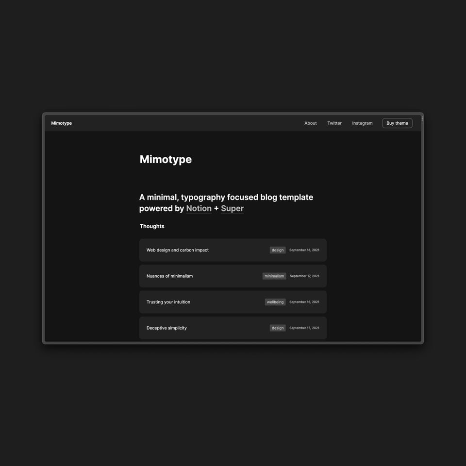 A minimal, no-code typography focused blog theme powered by Notion and Super. Simple and lightweight with a strong focus on the beauty of typography, Mimotype is a customisable blog template.