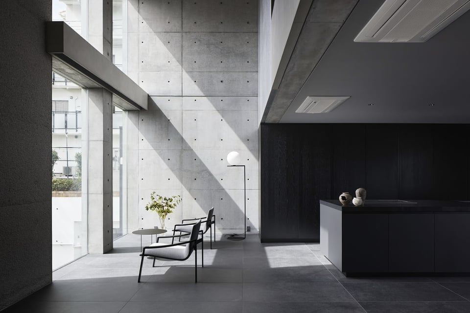 This minimalist home designed by GOSIZE is a refined three-storey concrete exposed house located in Ashiya, Hyogo Prefecture. Due to its proximity to neighbouring apartment buildings and a busy road, the emphasis was placed on blocking sightlines and noise. The design incorporates a Japanese perspective, creating a blurred relationship between the interior and exterior, with gently rising exterior walls of varying heights serving as boundaries.