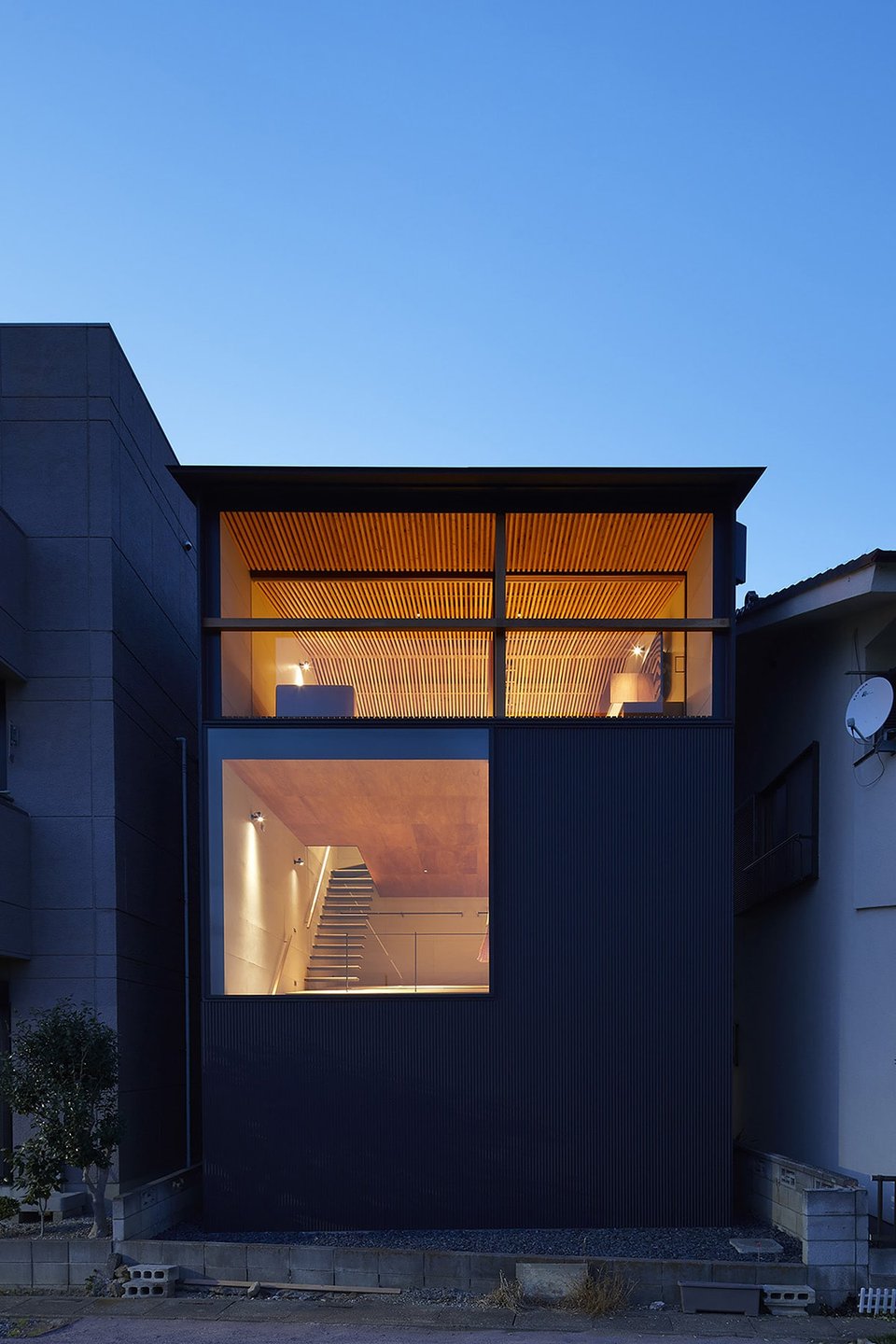 Located in Koshigaya City and nestled between a row of houses that line a river, with rows of cherry blossom trees visible across the street, House in Gamo is a minimalist dwelling with a dark facade and a spacious, open-plan interior that spans three floors. Designed by Suppose Design Office, the architects created a space where the focus is on admiring the view of the landscape—scenery of the city and the river brings a variety of seasonal changes and directs a relaxed life.