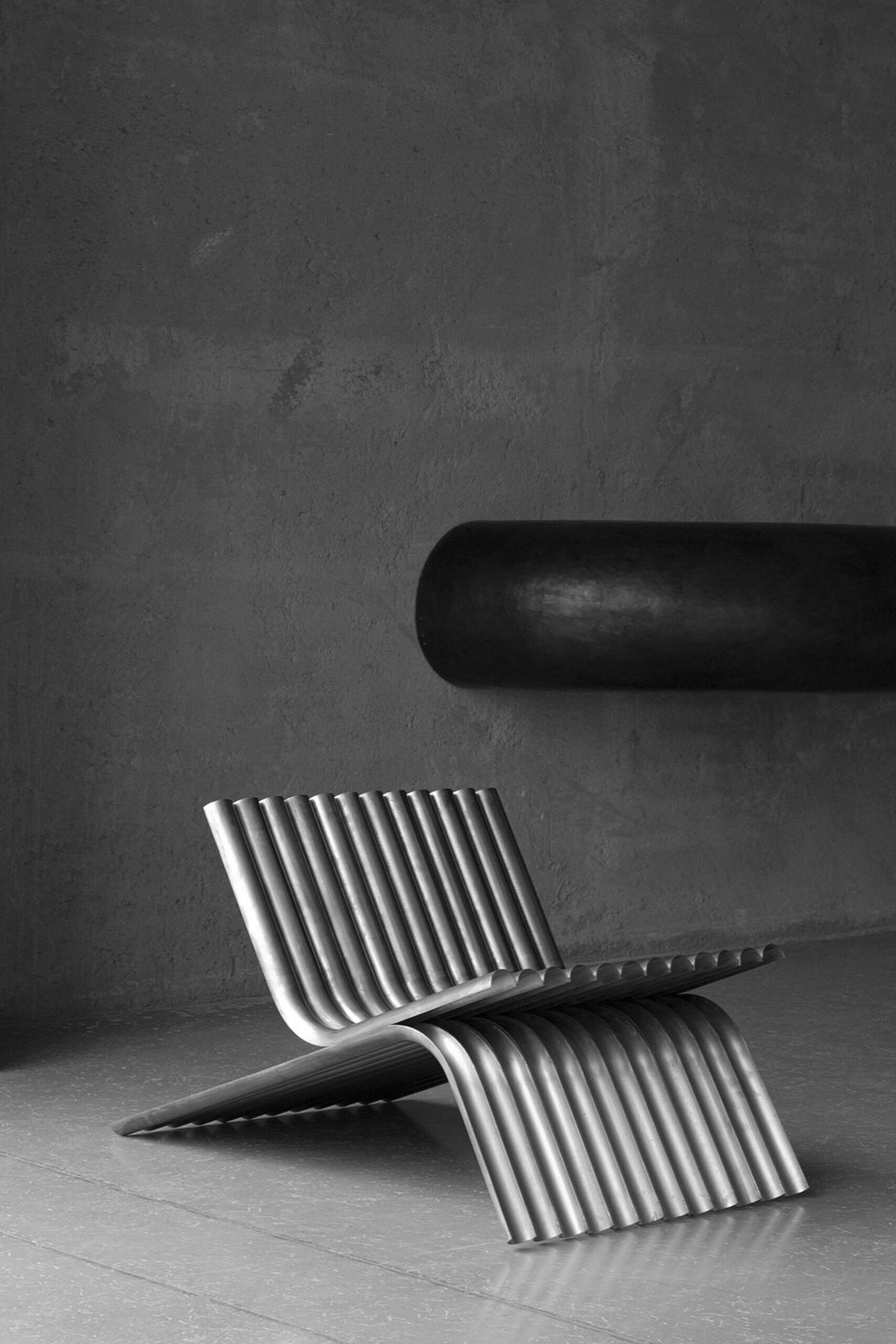 The OBJ-02 chair, designed by Manu Bañó, embodies the essence of minimalist design. This low lounge chair, crafted in 2021 as a limited edition of only 10 pieces, is a unique combination of brass and steel. Its design features brass tubes, each meticulously cut in half and independently bent to form the chair's back, seat, and legs.