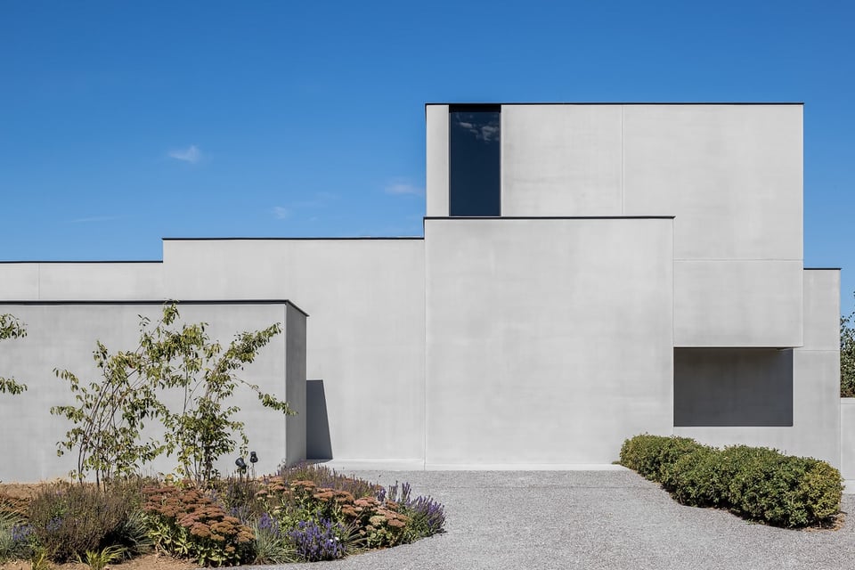 Situated in in the Belgian municipality of Erpe-Mere, Residence MG is a minimal and monolithic dwelling designed by Pieter Vanrenterghem. Defined by its clean lines, geometric forms, and monochrome palette with splashes of natural furnishings, the home has a sanctuary-like vibe to it beginning with the extremely minimal facade.