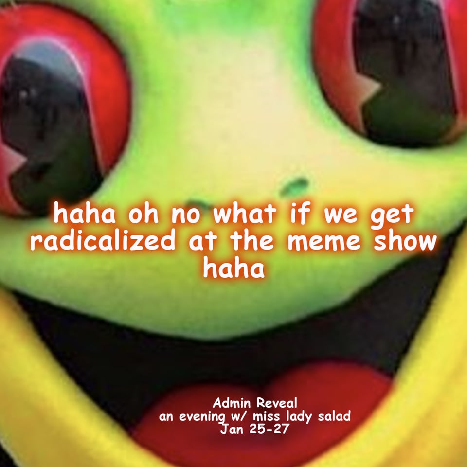 What does this have to do with my little meme show? My little meme show in which I talk about the literally thousands of little memes I've made over the past few years? My little meme show that is being funding by the Franklin Furnace FUND and being produced at the Exponential Festival? Idk. But I will be talking a lot and sharing and I hope you will join.