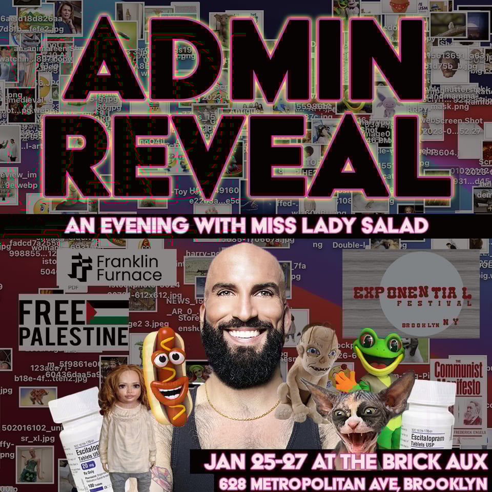 My show Admin Reveal opens tomorrow. I will show you weird memes about twinks and teach you how to divest from banks that profit off of genocide and climate destruction.