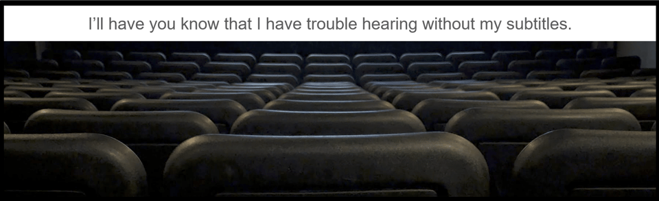 An empty movie theater with white space simulating the bottom of a movie screen with text that reads: