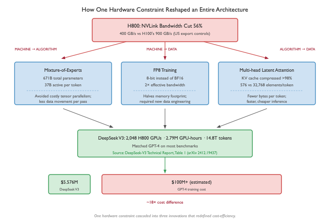 US export controls barred China from buying NVIDIA's top-tier H100 GPUs. DeepSeek trained on H800s, the same silicon but with NVLink bandwidth cut by 56%. That single Machine constraint cascaded across every axis of the D-A-M taxonomy.