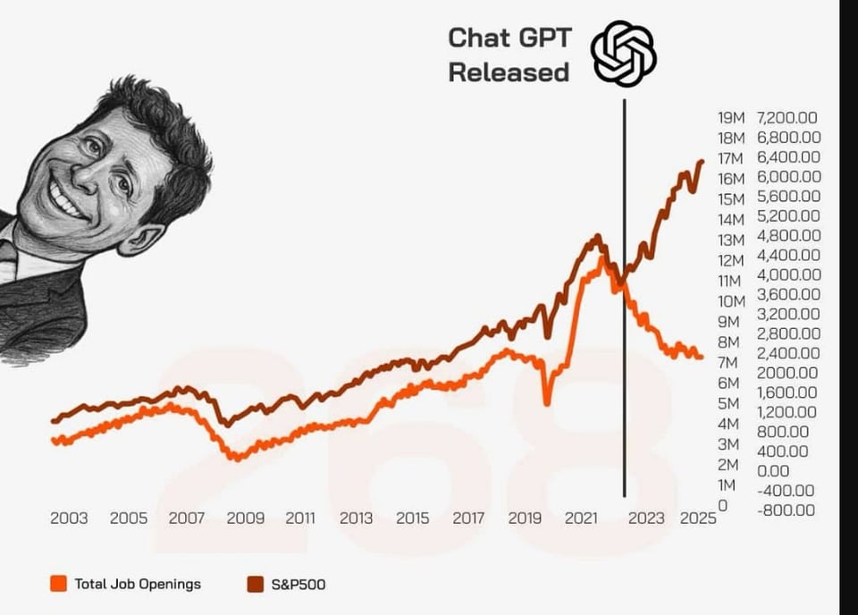 There is a great divergence in our economy. As this fairly infamous chart has shown, there is a divide in the economy right now between absolutely astronomical economic growth on the back of AI investment, with NVIDIA at the core (5 trillion valuation for Q3 2025 posted just four days ago as I write, completely bonkers numbers), and absolute stagnation of job growth and wages. Some have pointed out that the reason for this job stagnation is not really AI replacing jobs, and that’s true so far as it goes. Most roles are not automated; AI’s promised efficiency gains (and labor cost reductions) have yet to arrive. But focusing on that misses the point that, in a historically unprecedented way, enormous economic investments in a new technology are not resulting in any build-out of a workforce. Companies are preparing for a future in which they need far fewer workers, not one where they need workers trained in AI. The specific reasons for this are a bit more complicated than just a bet on automation, and have origins in the last decade of labor casualization and investments in cloud capital. Whatever you think of the overall new-feudalism thesis, I think Yanis Varoufakis offers the easiest to follow narrative of economic transformations since 2008 in Technofeudalism.