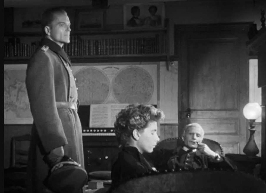It’s a stark film for 1849. Mostly takes place in a single room and only with one major speaking role. We can see here, alongside Bresson (and those neorealists in Italy), that the first move of post-war realism in film is minimalism. Minimal sets, minimal lighting, minimal cast. Some of this stripping away is economic. Melville was working outside the studios, renting equipment, shooting in whatever village house he could find. The film is the story of the billeting of a Wehrmacht Officer in a country village house inhabited by an older man and his adult daughter in the northern occupied zone. As in the novel, the old man narrates the film (in VO) but within the diegesis, he does not say a word. In VO he remarks that he and his daughter came to a silent accord that they would allow the billeted officer into their home, show him to an unoccupied room, but never say a word to him. This silent treatment is the film’s depiction of the silent resistance of the common French people who could not openly fight.