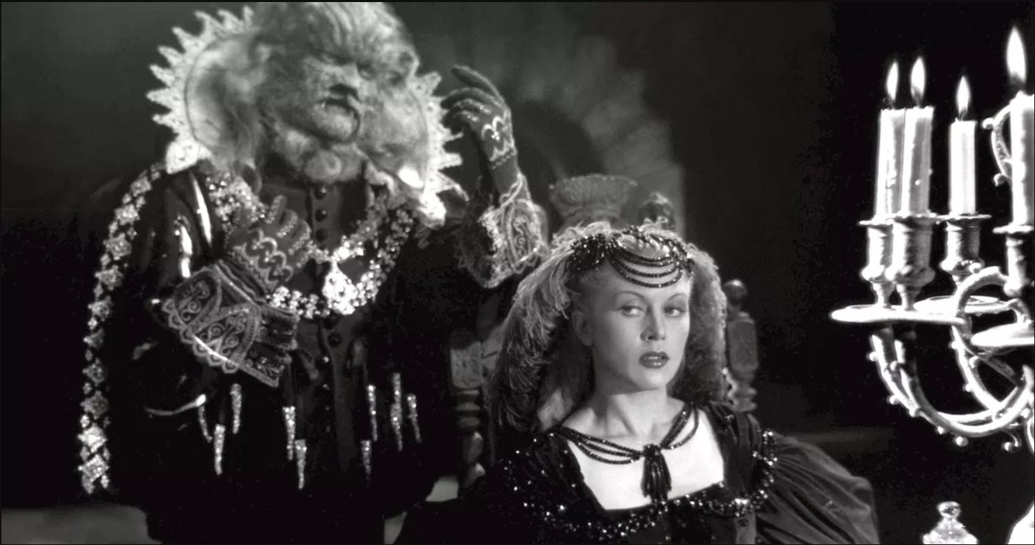 Yet, read in context, his films are in a unique relationship with post-war realism, even as they offer fantastical dream-like images. La Belle and La Bete was made immediately after the war, his first narrative film (Blood of the Poet is an abstract and surreal piece of high modernism, the films he made after the war you could imagine screening at the Alamo Drafthouse—still art films, but accessible to wider audiences). It is a classic fairy tale, but very far from Disney, where male eroticism, cruelty, and death haunt every image. It also uses a unique double casting, where both The Beast and the Gaston figure are played by the same actor, Jean Marais, Cocteau’s lover, and Belle expresses love for both of them (here Gaston is called Avenant, and he’s less villainous, more a playful scoundrel who has real affection for Belle but gets trapped by the greed of his social set).