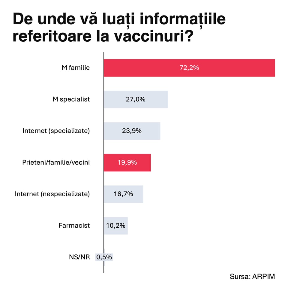 Este bine totuși, iar dacă ne uităm la diseminarea informației vedem că cei mai mulți își iau informațiile de la medicul de familie (72,2%). Important este să ne uităm și la prieteni și vecini pe care 1 din 5 români se bazează pentru informații medicale.