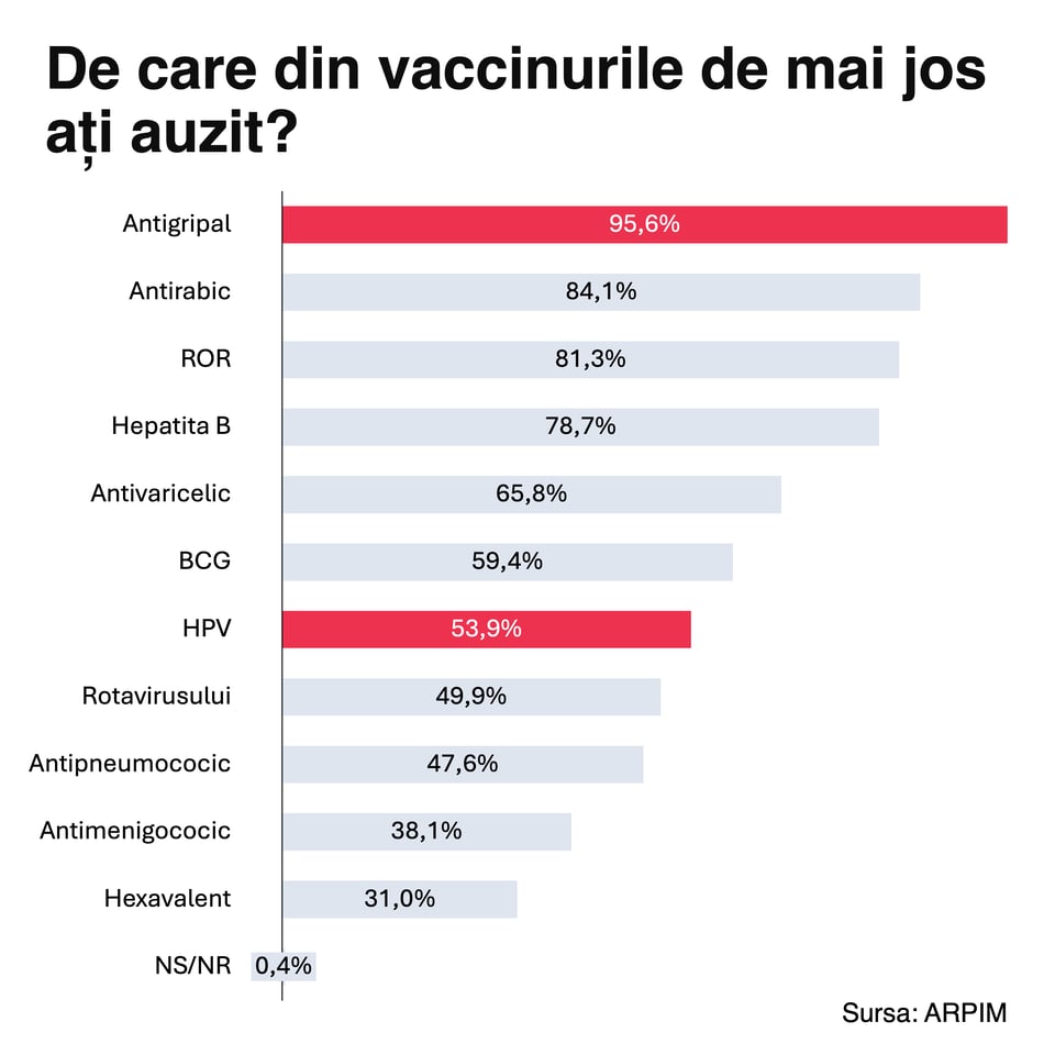 Conform Barometrului Sănătății 2023 realizat de ARPIM, 53,9% dintre persoane au auzit de vaccinul contra HPV. Un procent relativ redus comparativ cu cei care au auzit de cel antigripal - 95,6%.