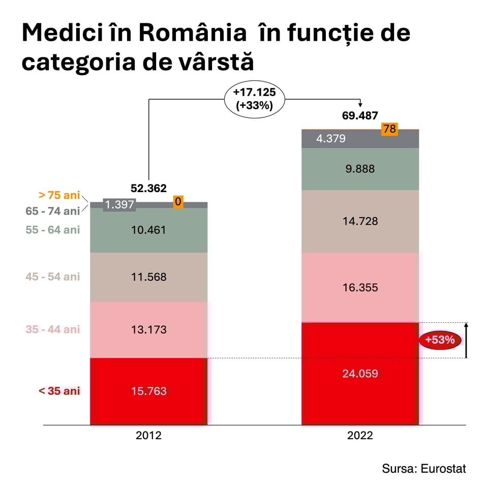Îmbătrânirea forței de muncă este un fenomen vizibil în piața forței de muncă din România, dar mai puțin în Sănătate: numărul medicilor de peste 55 de ani a crescut cu aproximativ 2.000 de lucrători. Creșterea este modică, iar în 2022, doar 78 de medici care profesau aveau peste 75 de ani.