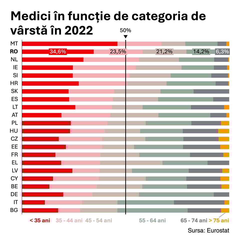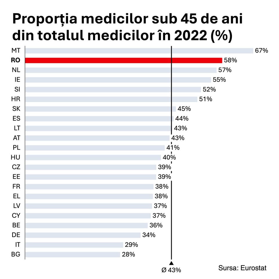 România este o anomalie la nivelul Uniunii Europene, unde peste 58% dintre medici au vârsta sub 45 de ani. Media europeană este de aproape 43%, iar în țări precum Germania aceasta este de 34%, în Franța de 38% și în Belgia de 36%.