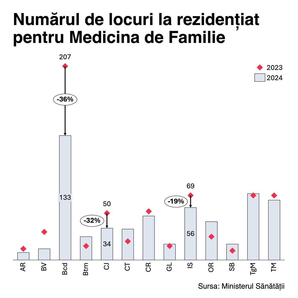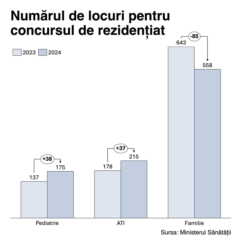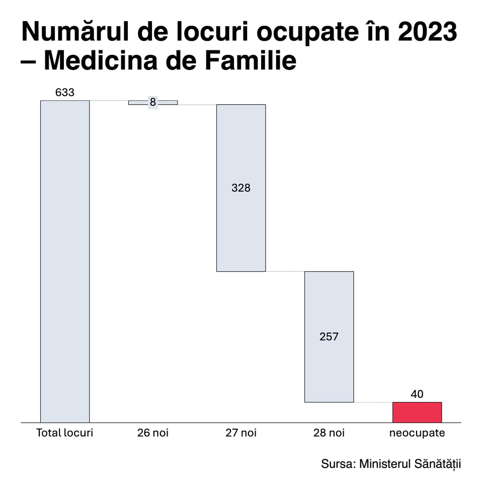 Situația era similară și anul trecut. În primă fază, în noiembrie 2023, la medicina de familie, doar 8 locuri din 643 s-au ocupat. De-abia după ce rezidenții au observat că specializările preferate s-au epuizat, au început să se îndrepte către medicina de familie.