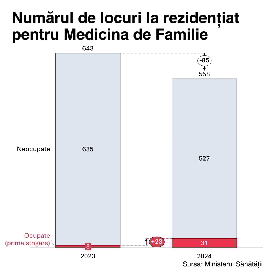 Din cele 558 de locuri scoase pentru Medicina de Familie, doar 31 au fost ocupate la prima strigare (27.11.2024). Este o creștere față de 2023, doar că în continuare Medicina de Familie nu reprezintă o prioritate pentru niciunul dintre viitori medici.