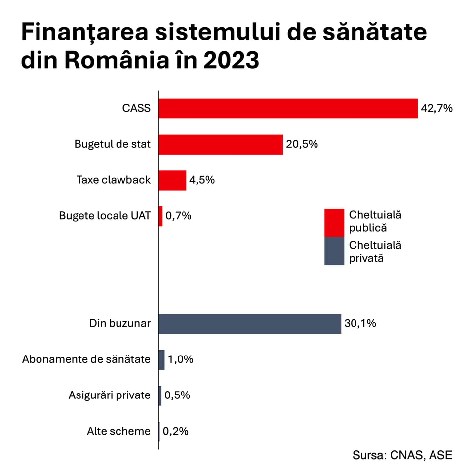 În jur de 68% sunt cheltuieli publice, iar la buget se mai adaugă și acel 4,5% din taxele clawback - taxa pe medicamente.