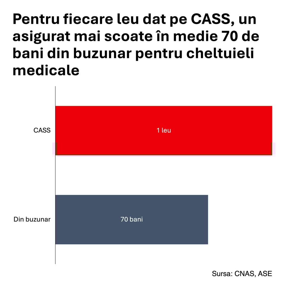 Șocant este procentul de 30,1% din totalul finanțării care vine din buzunarul persoanelor (atât asigurați, cât și neasigurați). Pentru a simplifica argumentul, dacă am presupune că un asigurat cheltuie 1 leu în CASS, mai dă pe lângă aceștia și 70 de bani. O sumă modică, dar dacă înmulțim cu 1000 atunci: