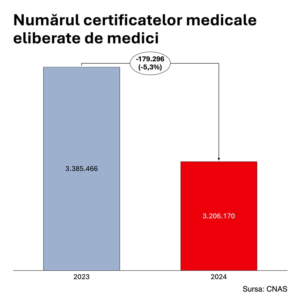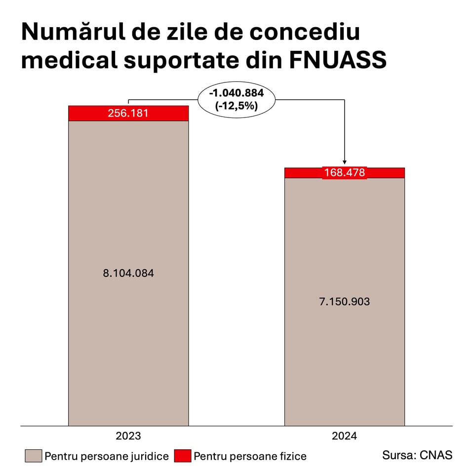 În 2024, numărul zilelor de concediu medical suportate din FNUASS a scăzut cu 1.040.884 față de anul precedent, adică cu 12,5%. De asemenea, numărul certificatelor medicale eliberate de medici a scăzut cu 5,3%, ajungând la 3.206.170, față de 3.385.466 în 2023.